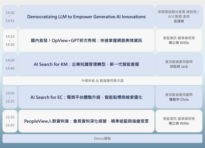 意藍資訊(6925)是國內首屈一指的AI智能數據代表廠商,2023年7月至9月,我們首次對外發表智能關鍵技術的系列活動,說明AI如何提供企業最即時的洞察及最精準的預測、引領企業邁向卓越。非常感謝共襄盛舉的貴賓們!